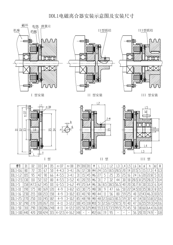 二、使用說明         該離合器屬干式必須在無油狀態(tài)下工作;與離合器配合的軸孔與軸的精度為H8/h7,同軸度不大于0.1mm;安裝后不允許軸向竄動,同時應保證工作氣隙。